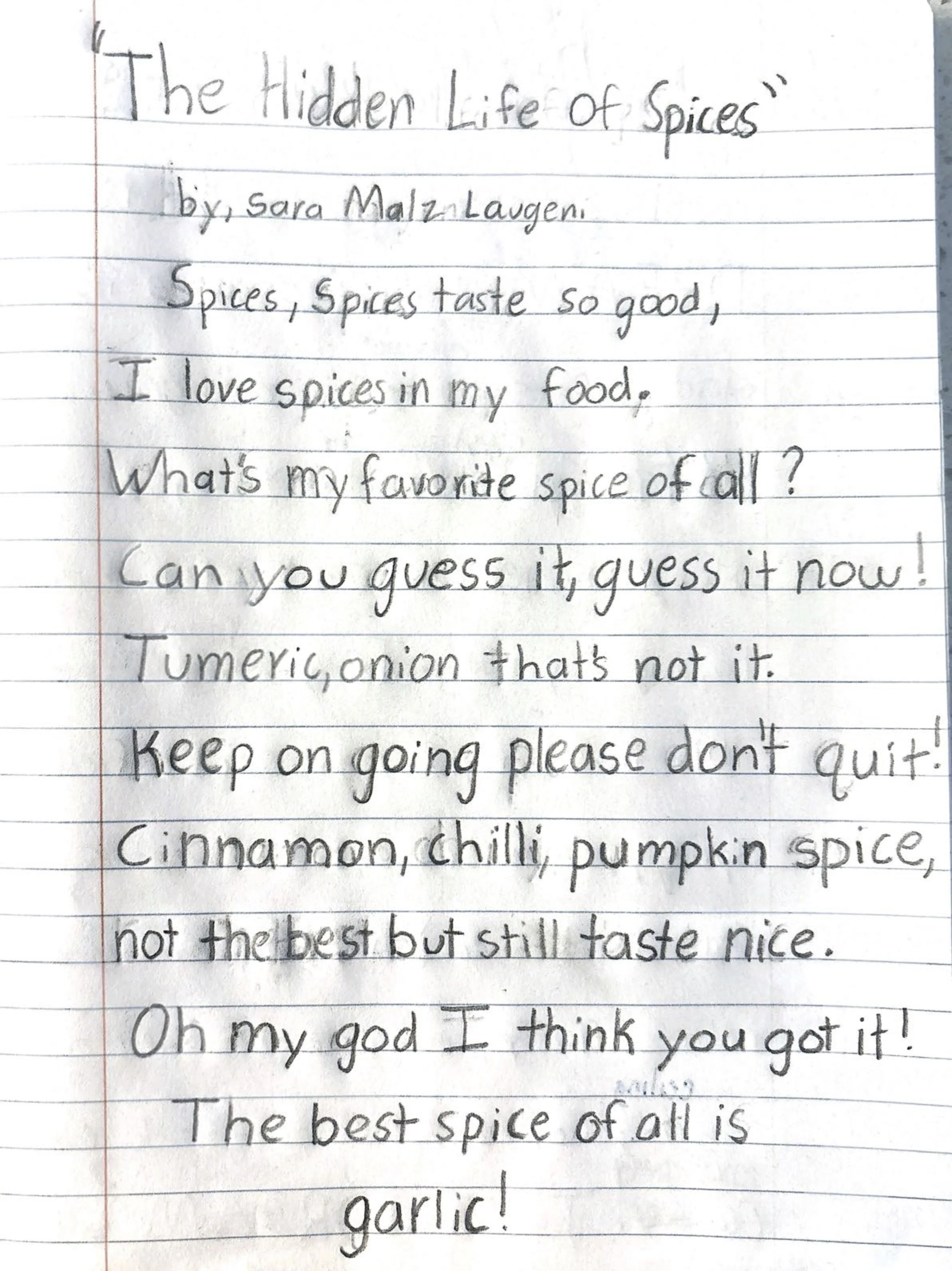As part of the celebration of 2025 National Chemistry Week (NCW), the Princeton Section of the American Chemical Society (PACS) sponsored the 2025 NCW Illustrated Poem Contest for students in Kindergarten through 12th grade in schools within the Princeton Section. For this contest, students within the Section were invited to write and illustrate a poem that fit the 2025 NCW theme of “The Hidden Life of Spices”. Notices of the contest were sent to all qualifying schools.